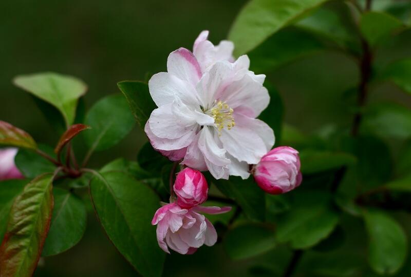 海棠花的花量多,花型大,花色素雅,有“花中神仙”“花貴妃”的美稱。其花沒有開放時,也就是花蕾的時候,紅艷艷的,等到花開之后,就轉變為粉紅色。