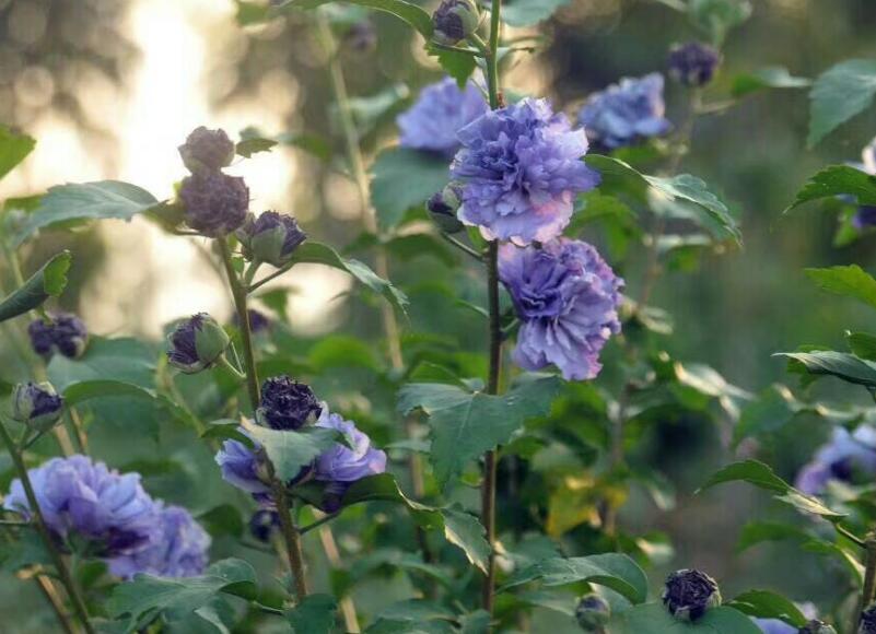 重瓣木槿藍(lán)莓冰沙這種植物開的花是藍(lán)色的,而且它的花瓣比較多,植物的生長高度通常在4米左右,它是一種很好看的植物,而且花朵比較多,開花時間也比較準(zhǔn)時,是一種受到大家喜歡的園林植物。