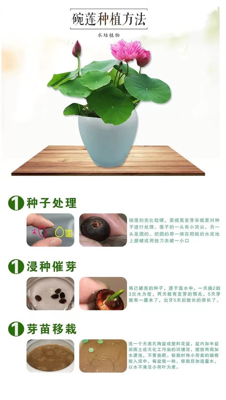 選擇健康、成熟的蓮花種子。成熟的種子會呈黑色或深褐色,并且具有完整的種皮和胚芽。準備好種子后,將其浸泡在清水中,大概2-3天,每天更換水,直到種子表面的外殼軟化。