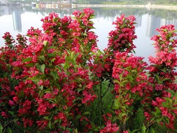 紅王子錦帶花,花色艷麗繁茂,開花時分紅綠相間,而且能在河畔潮濕環境中生長良好,是非常好的河畔觀賞植物。