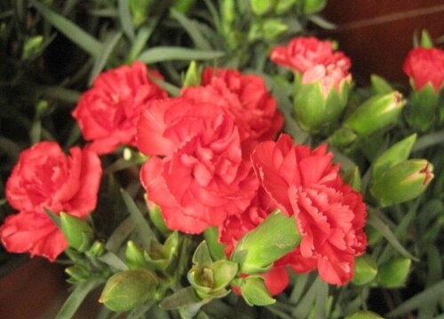 紅色康乃馨是一種草本植物,莖干多叢生,葉片對生呈禾草狀,花朵單生或者成聚傘花序,顏色為紅色,花瓣呈扇狀,花期在每年的4-9月份。
